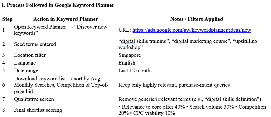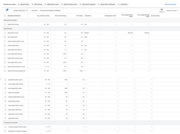 John uses Google Keyword Planner to identify high-potential keywords relevant to digital skills training in Singapore.