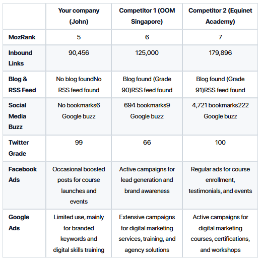 John analyzes top competitors using tools like Rankmath SEO Analyzer, producing a comparative table presenting John’s company (Innov Formation), Competitor 1 (OOM Singapore), and Competitor 2 (Equinet Academy) based on SEO project and research: