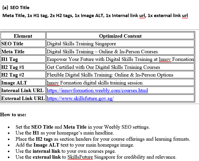 - Setting SEO titles and meta descriptions (e.g., “Digital Skills Training Singapore”)